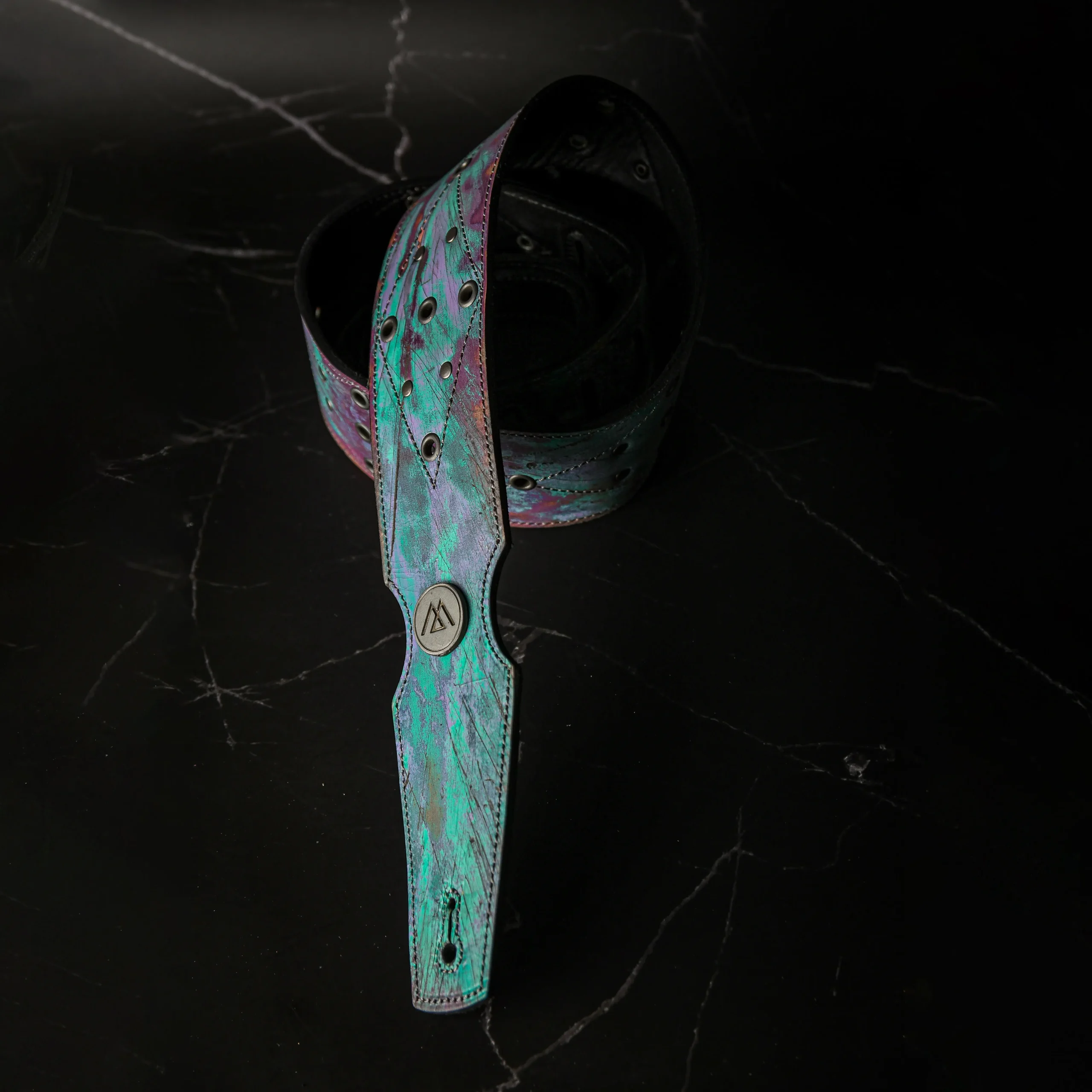 NIX es una correa de cuero exclusiva, intervenida con un proceso artesanal avanzado que supera los acabados relic tradicionales. Su estética presenta un complejo trabajo de texturas una variedad de colores generando un estilo psicodélico, realzados por ojales y remaches de plata auténtica.