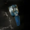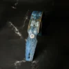 NIX es una correa de cuero exclusiva, intervenida con un proceso artesanal avanzado que supera los acabados relic tradicionales. Su estética presenta un complejo trabajo de texturas en tonos azules y plateados oxidados, realzados por ojales y remaches de plata auténtica.