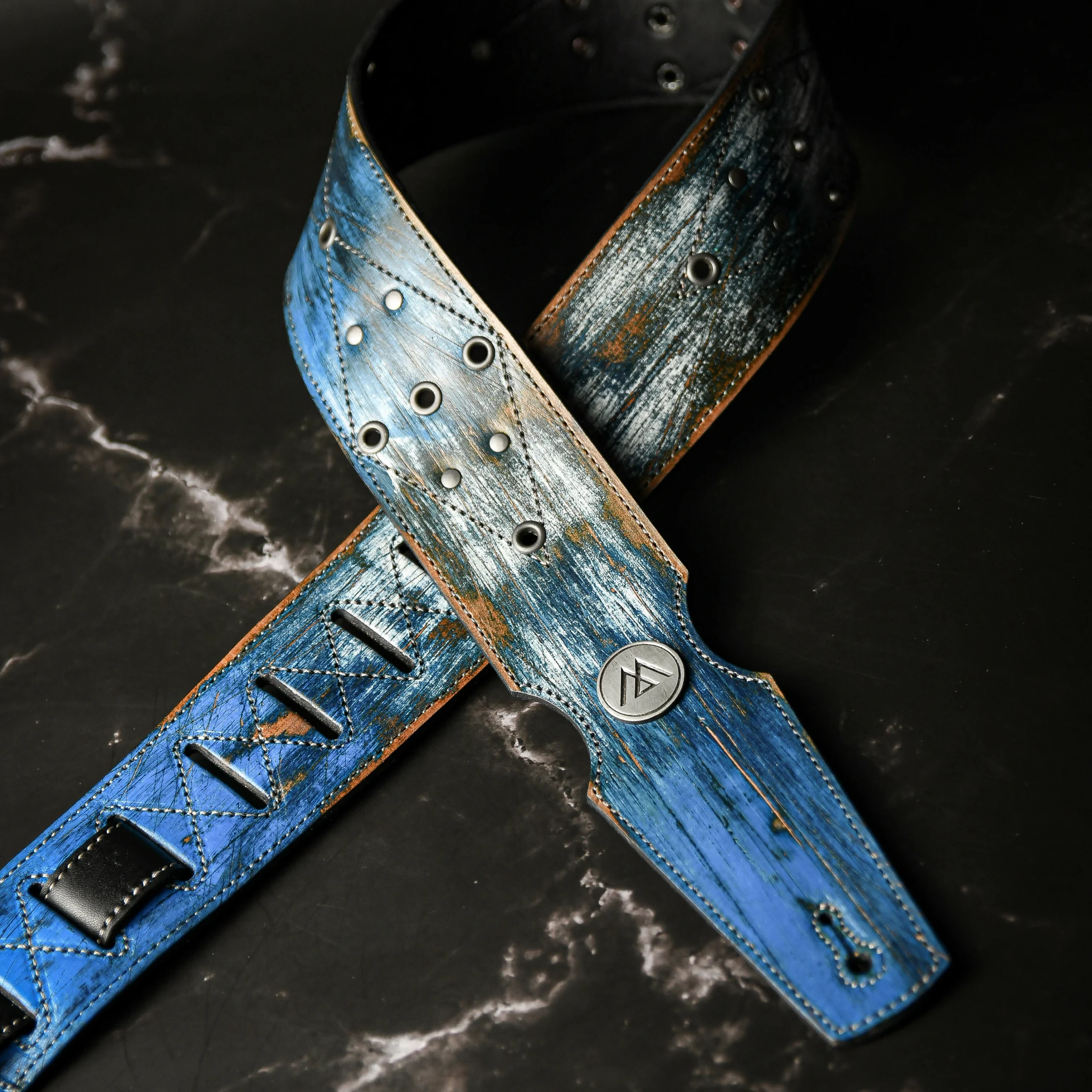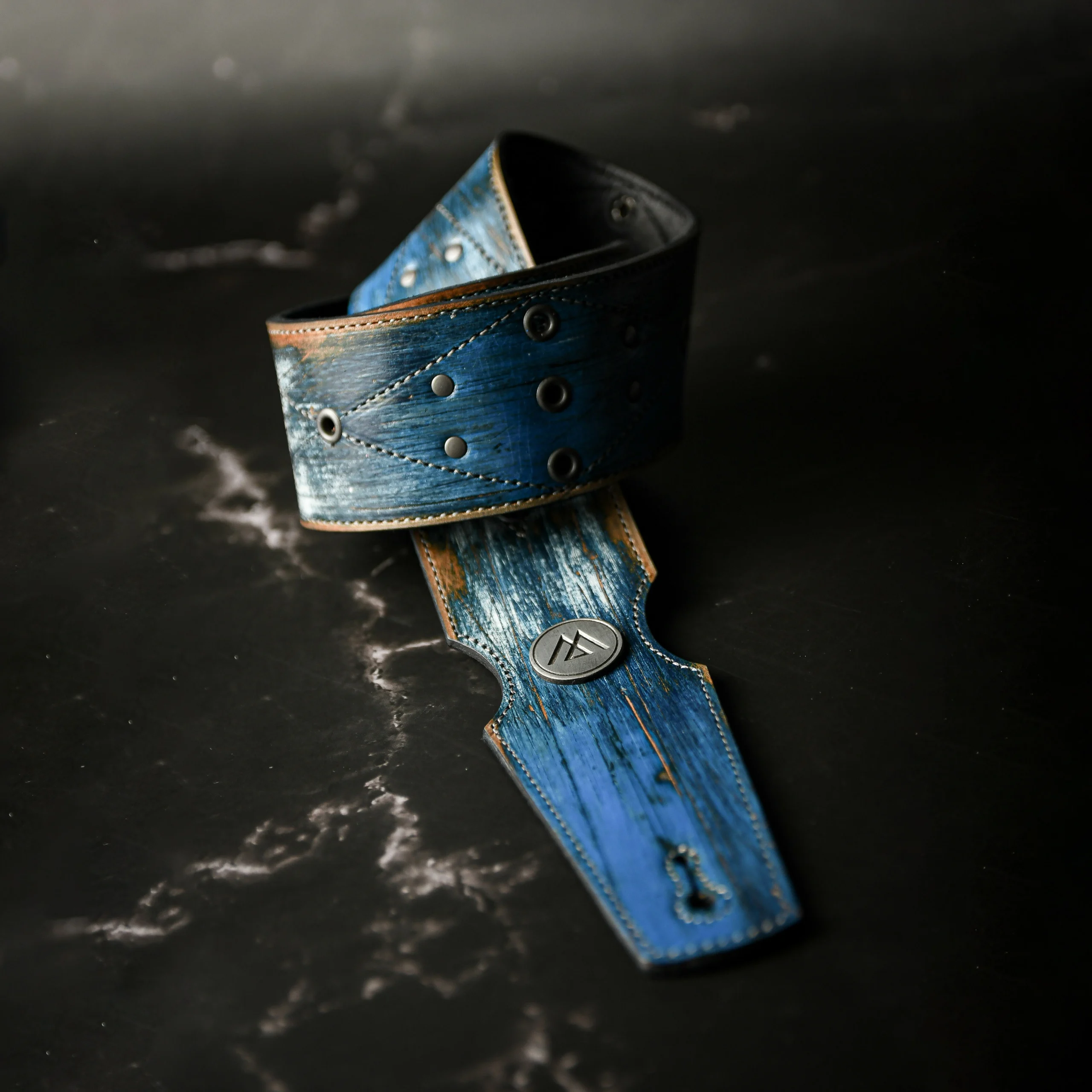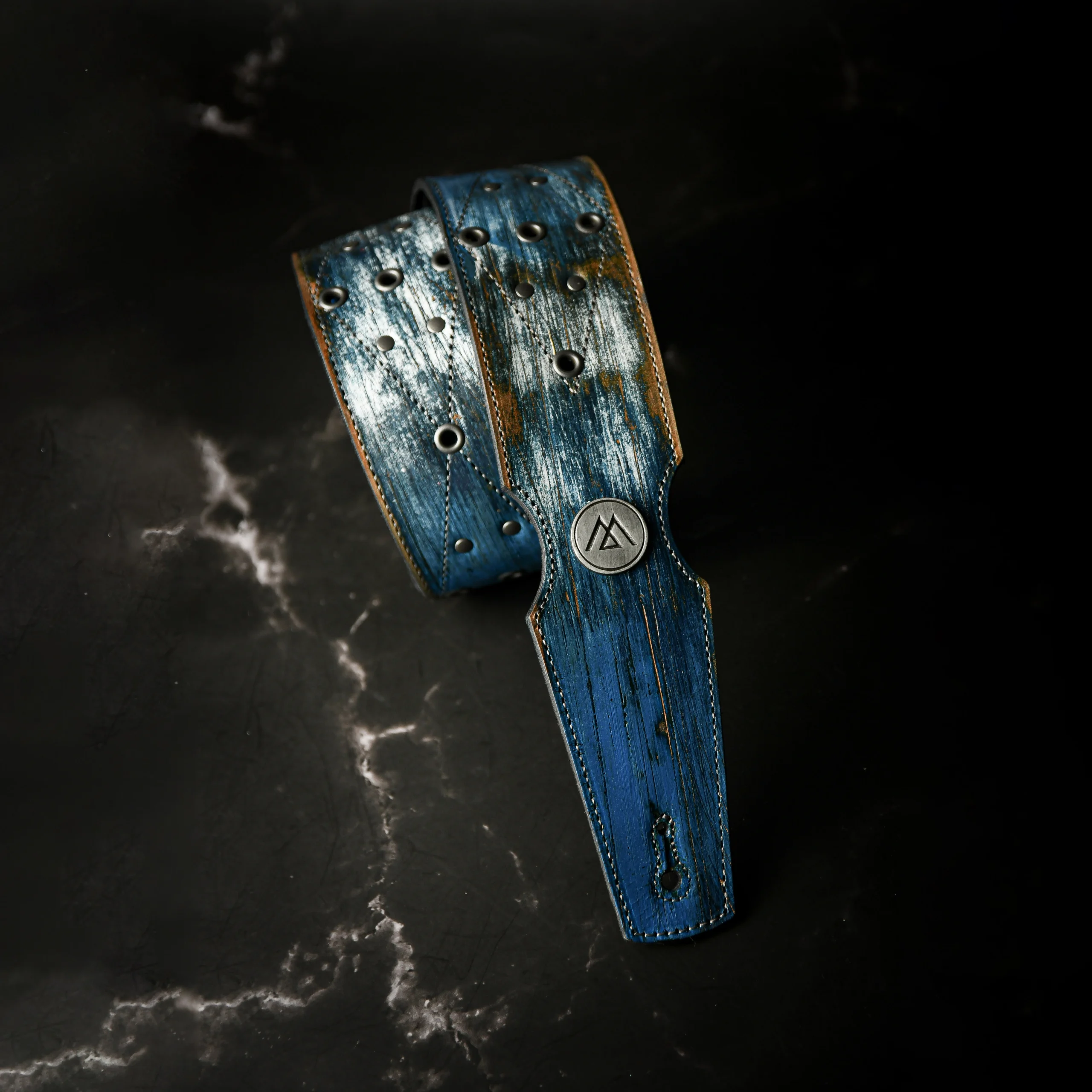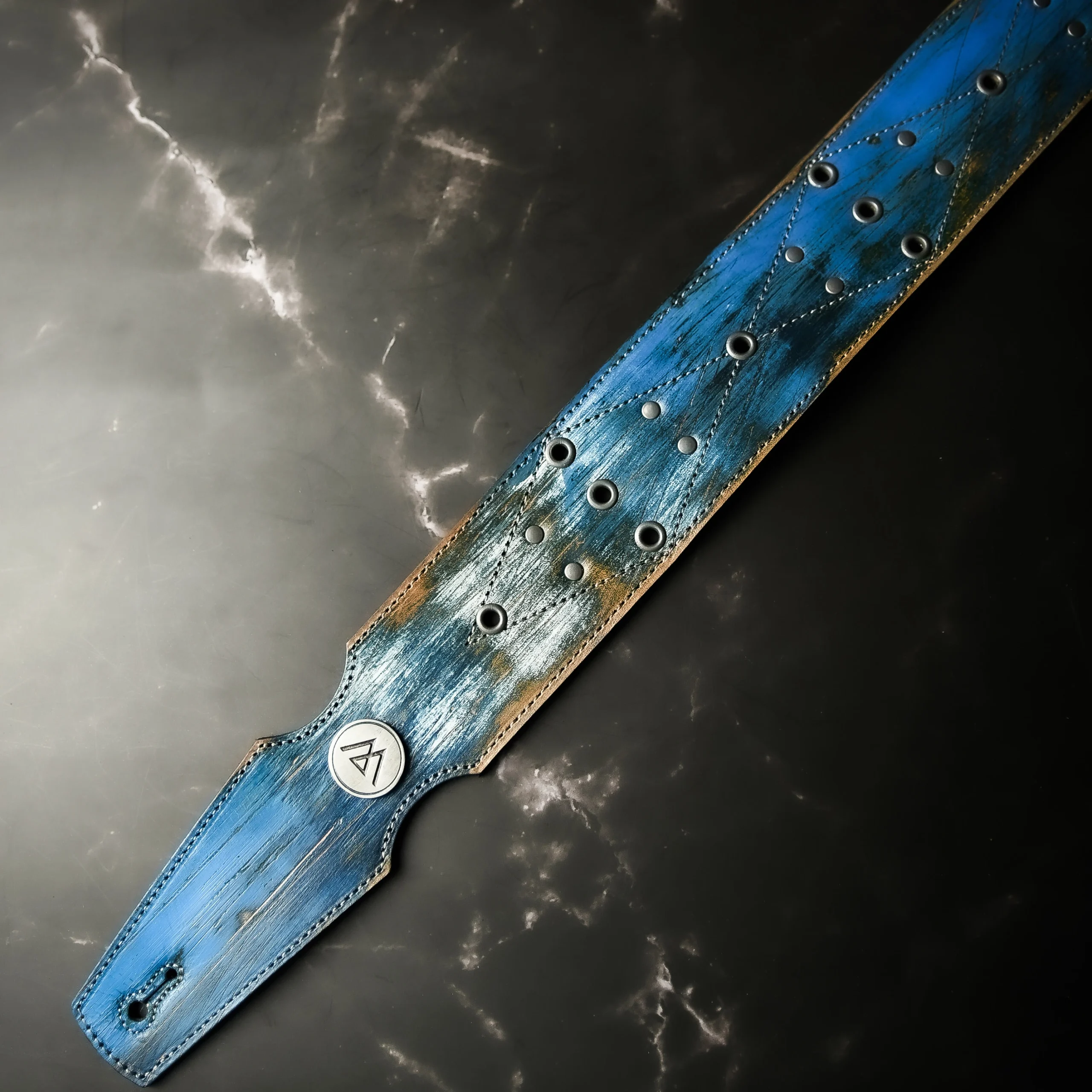 Esta pieza única nace de un proceso artesanal superior y complejo, logrando texturas irrepetibles en tonos azules y metales desgastados. Confeccionada con doble capa de cuero genuino para máxima solidez e intervenida con ojales y remaches de plata.