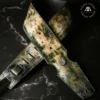 Su impacto visual reside en el contraste dinámico entre verdes profundos y destellos amarillentos, aplicados mediante un proceso artesanal de múltiples capas que emula una oxidación «tóxica» sobre el cuero. La estructura Nix incorpora costuras reforzadas en patrón geométrico, junto con herrajes de ojalillos metálicos y tachas que refuerzan su identidad industrial y robusta.