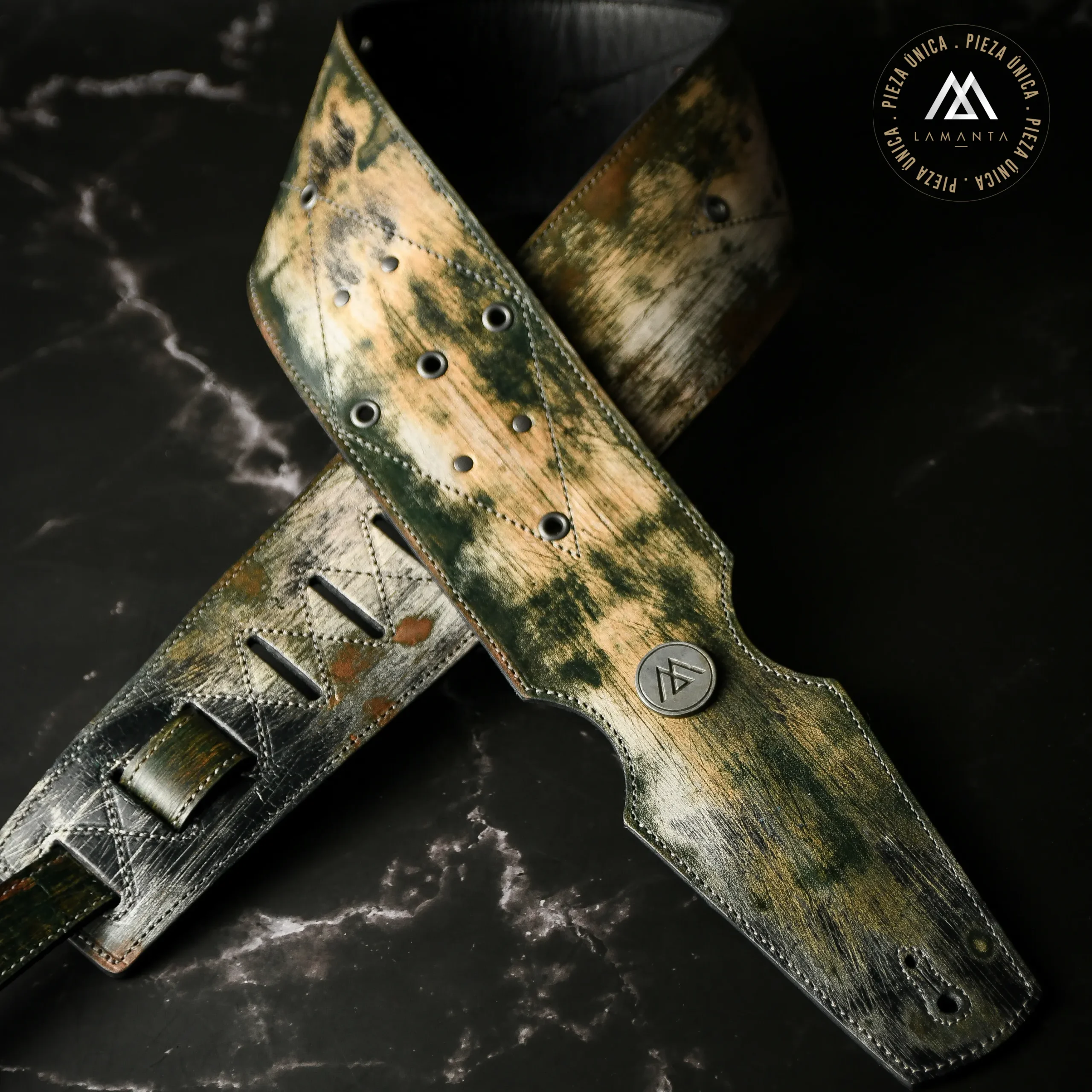 Con un ancho especial de 8 cm para mayor confort, la Nix Toxic Moss destaca por su acabado relic experimental en tonos verdes y amarillos ácidos. Una pieza de gran presencia, fabricada en doble capa de cuero genuino con detalles de ojalillos y costuras estructurales que definen su carácter artesanal único.