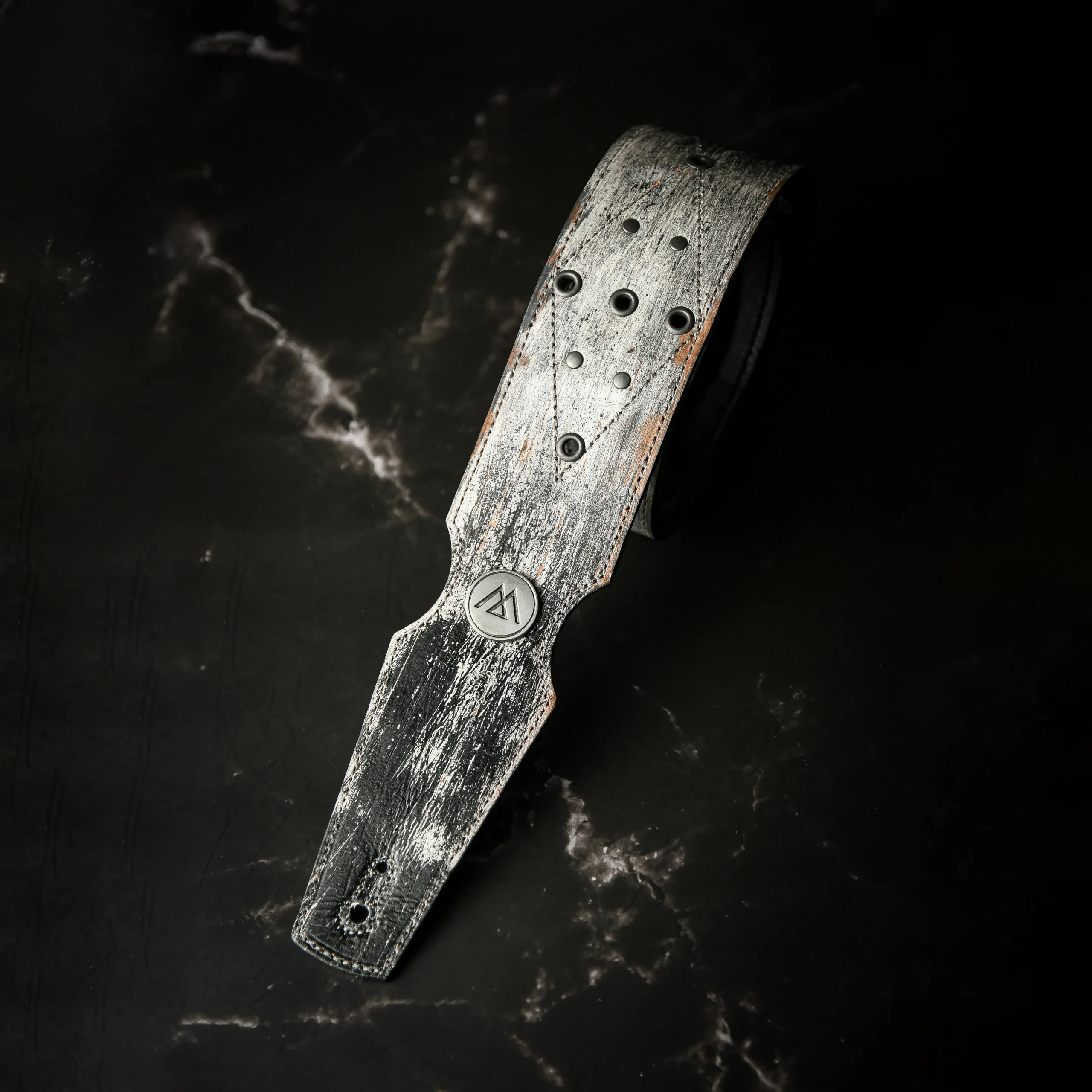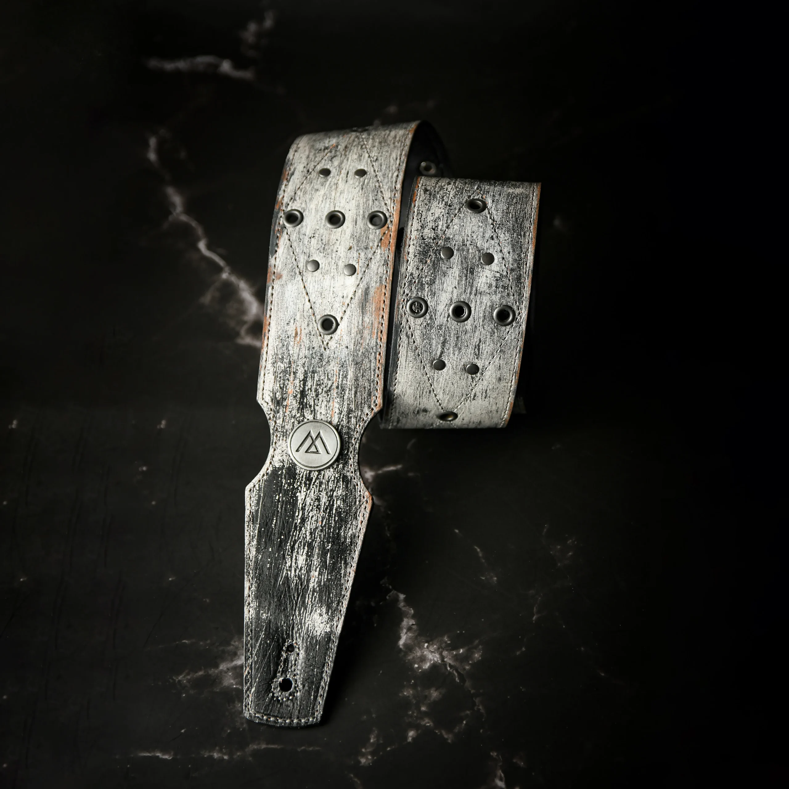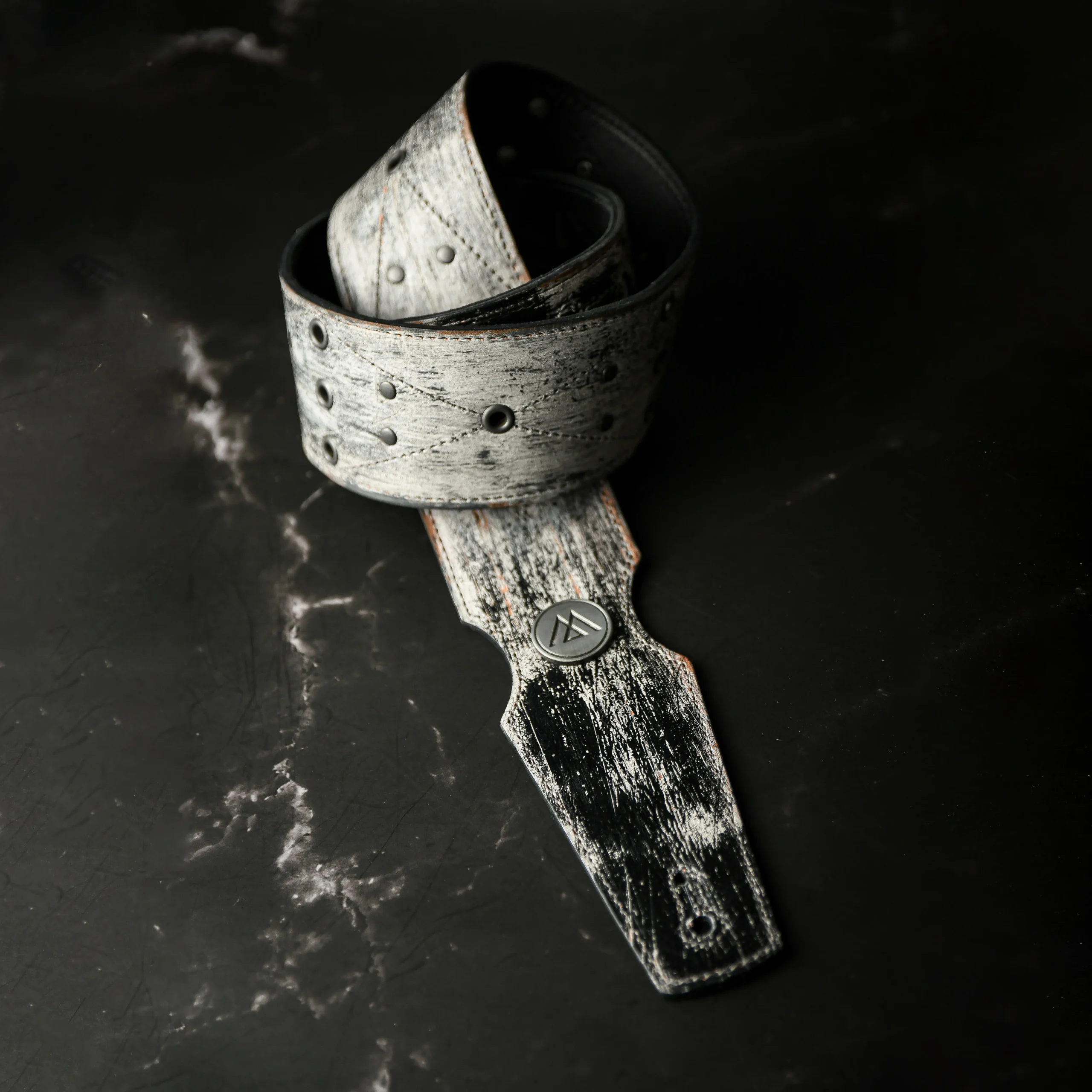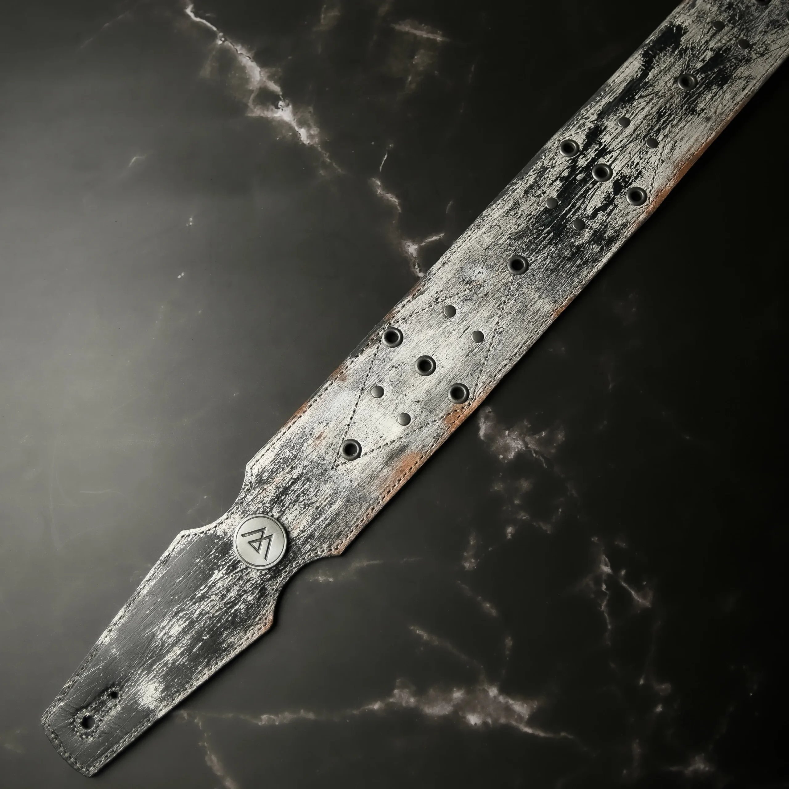 NIX es una correa de cuero exclusiva, intervenida con un proceso artesanal avanzado que supera los acabados relic tradicionales. Su estética presenta un complejo trabajo de texturas en tonos blancos y negros, realzados por ojales y remaches de plata auténtica.