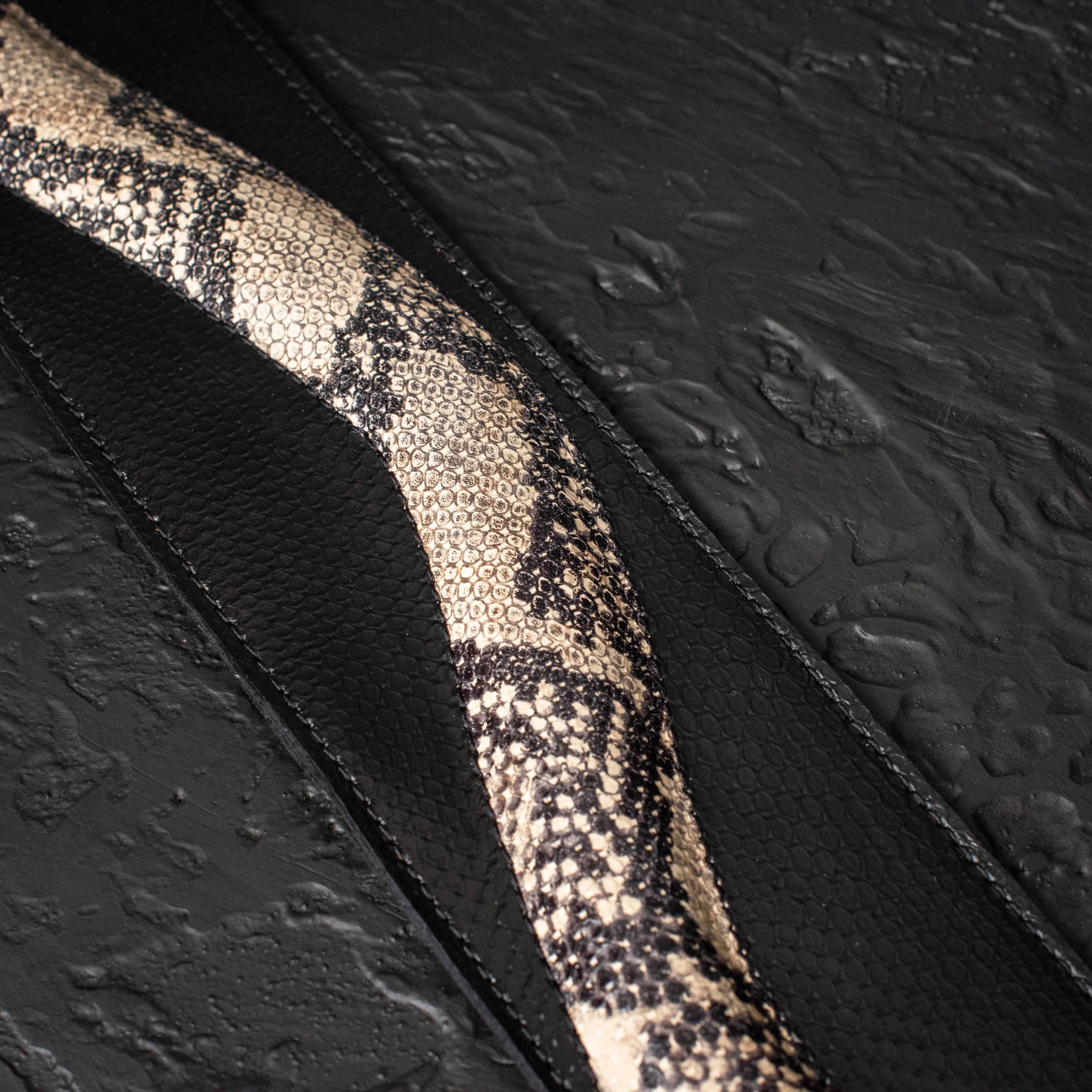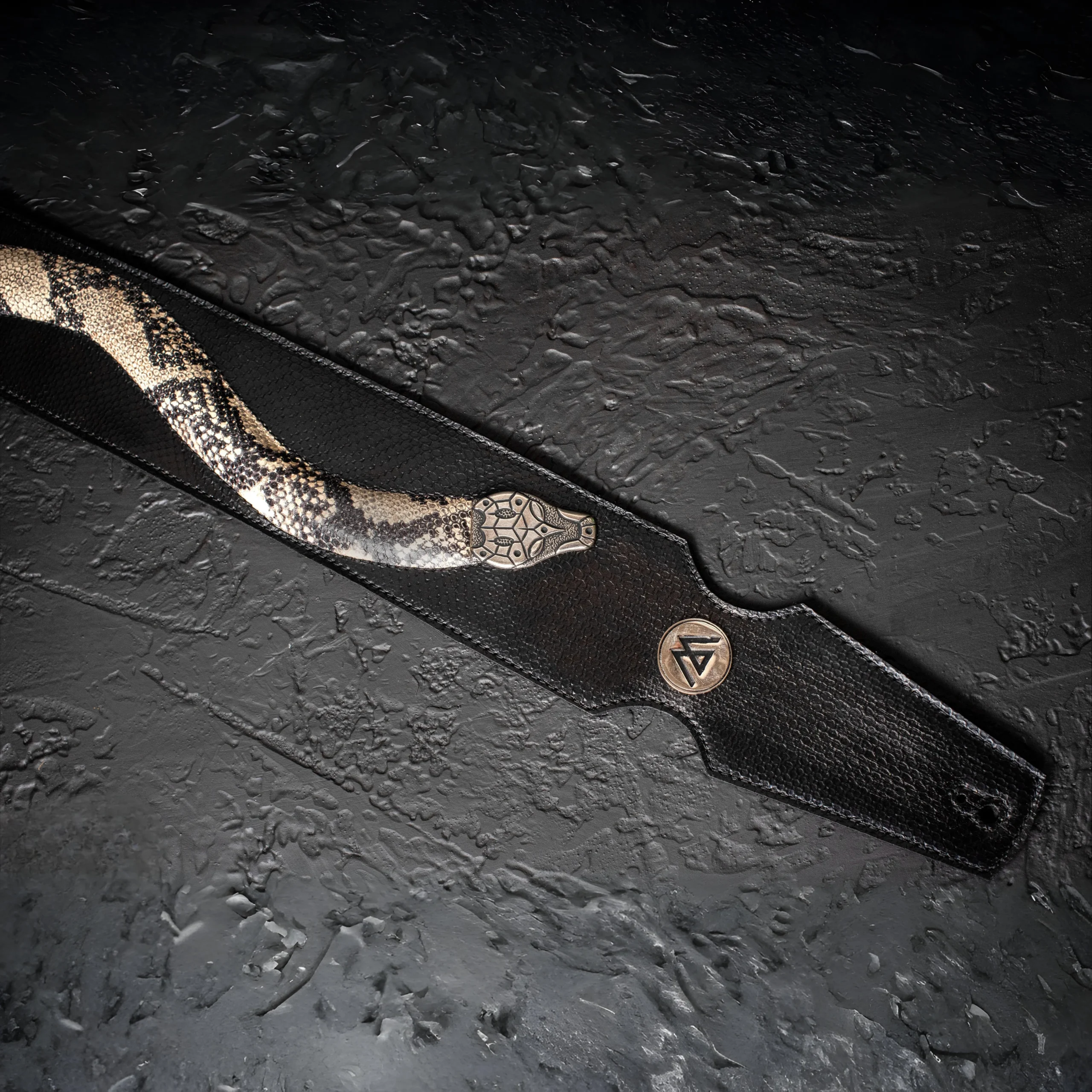 La SNK es una correa de 8 cm de ancho, construida en dos capas de cuero que aseguran resistencia, comodidad y durabilidad. Su superficie imita la textura de una serpiente, pero el protagonismo lo toma la figura central: una serpiente con volumen y cuerpo relleno además de una cabeza metálica bañada en bronce o plata. Una pieza de alto impacto visual para destacar en cualquier escenario, esta correa une detalle artesanal, fuerza estética y presencia escénica.