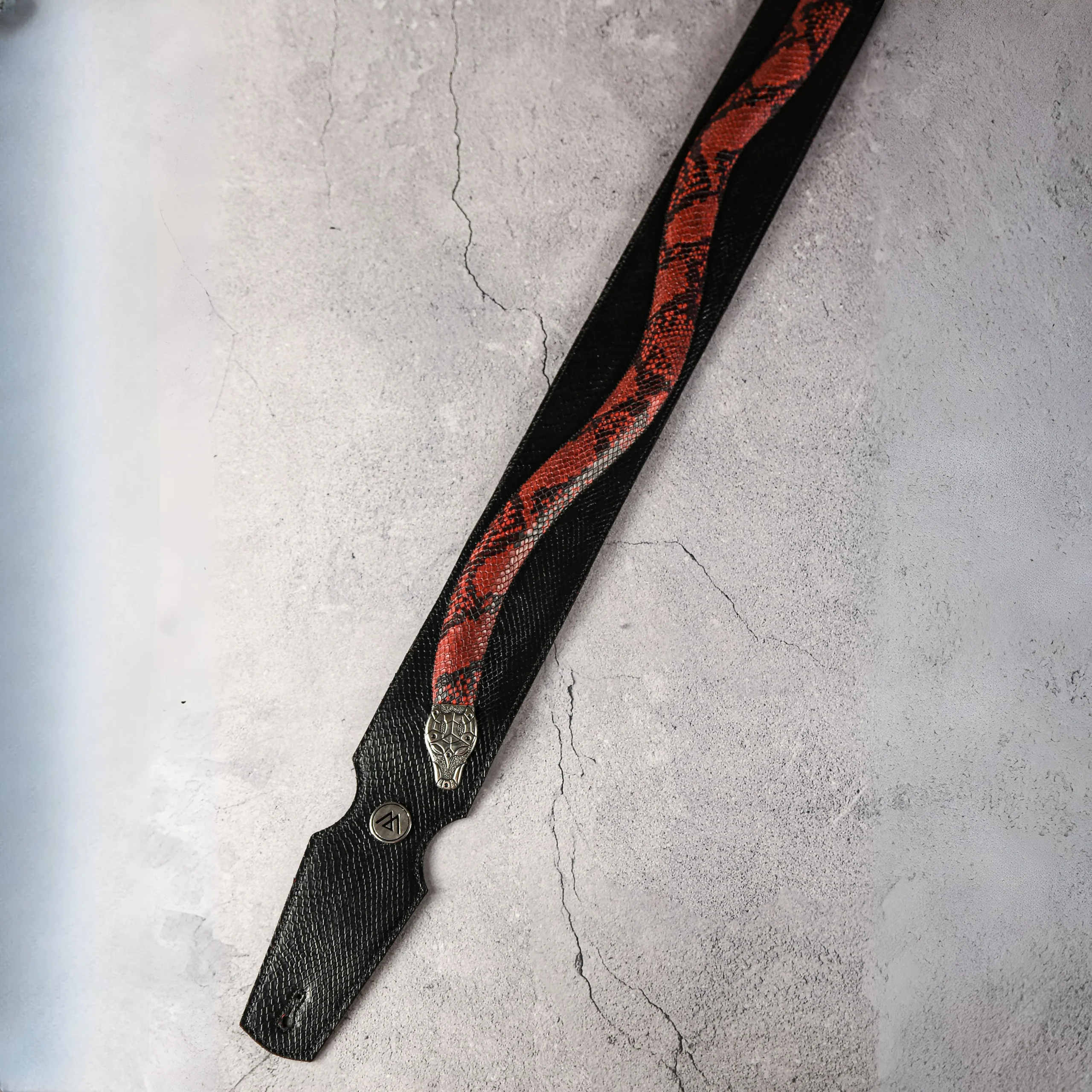 La SNK es una correa de 8 cm de ancho, construida en dos capas de cuero que aseguran resistencia, comodidad y durabilidad. Su superficie imita la textura de una serpiente, pero el protagonismo lo toma la figura central: una serpiente con volumen y cuerpo relleno además de una cabeza metálica bañada en bronce o plata. Una pieza de alto impacto visual para destacar en cualquier escenario, esta correa une detalle artesanal, fuerza estética y presencia escénica.