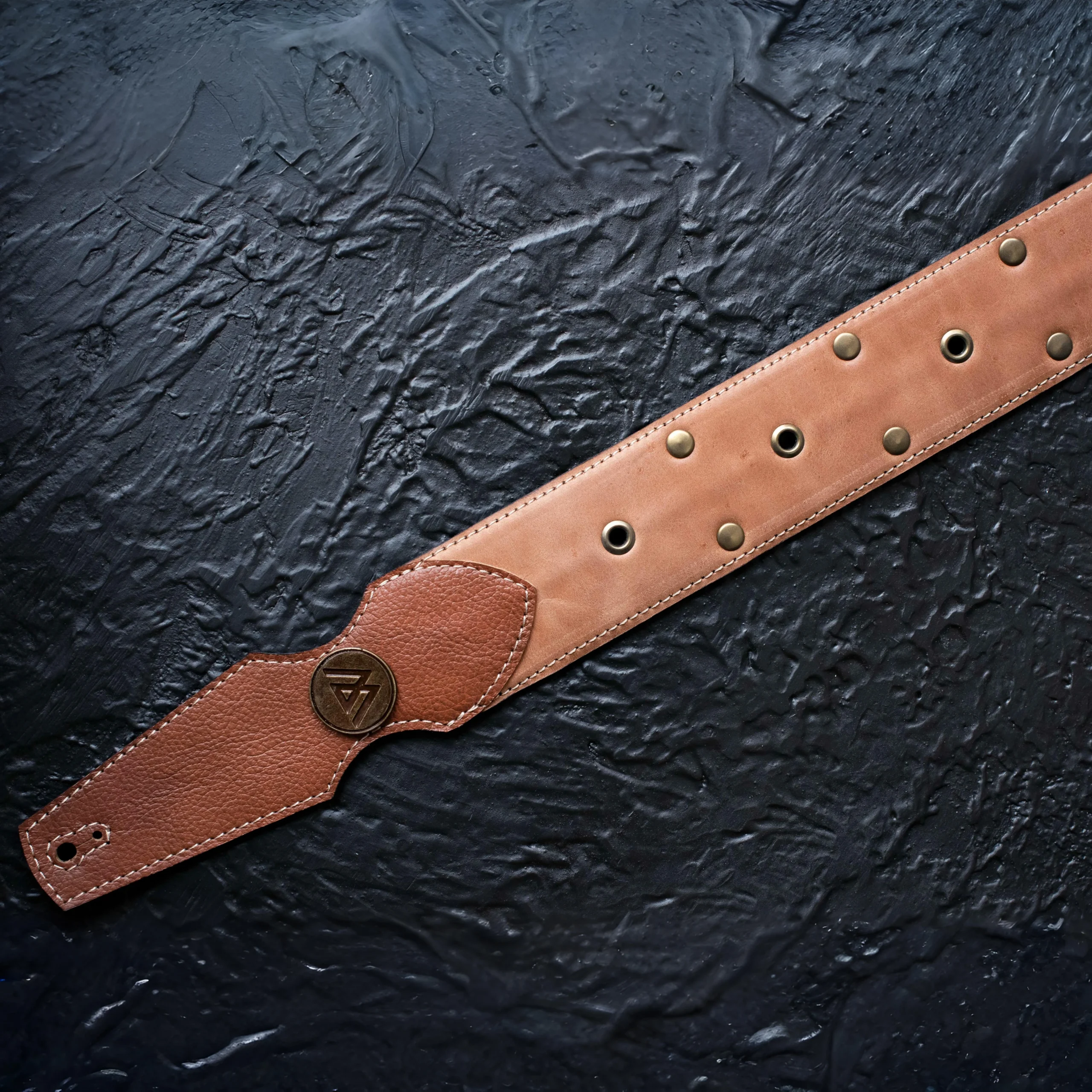 La TRC es una correa de guitarra de 6 cm de ancho, confeccionada a mano con dos capas de cuero genuino que aseguran resistencia y durabilidad. Su diseño se caracteriza por una hilera doble de remaches metálicos que recorren todo el frente, aportando un estilo firme y definido sin elementos decorativos adicionales. Tiene un largo regulable entre 1,10 y 1,45 metros.