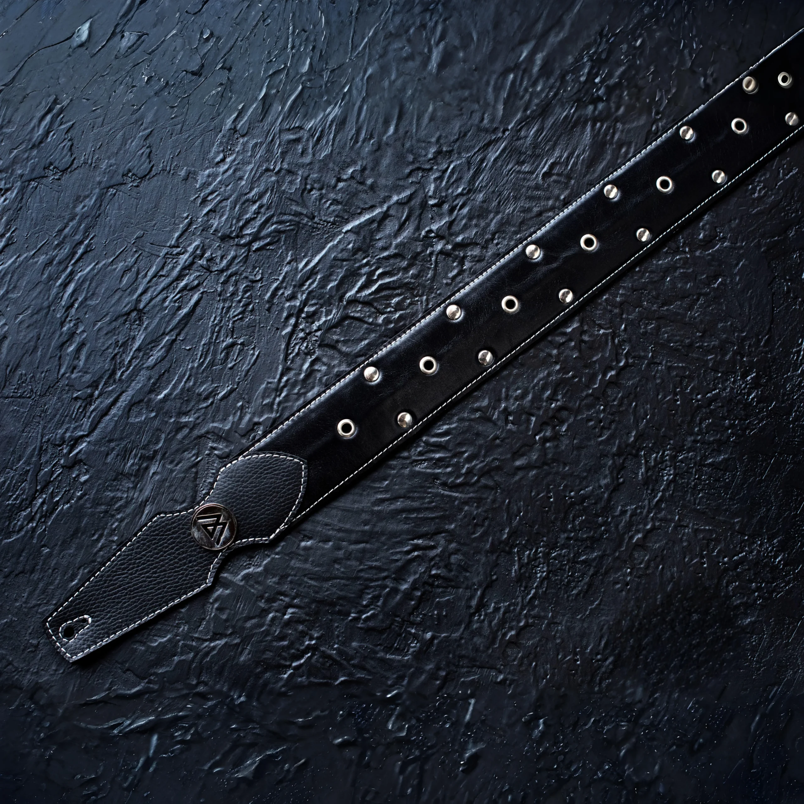 La TRC es una correa de guitarra de 6 cm de ancho, confeccionada a mano con dos capas de cuero genuino que aseguran resistencia y durabilidad. Su diseño se caracteriza por una hilera doble de remaches metálicos que recorren todo el frente, aportando un estilo firme y definido sin elementos decorativos adicionales. Tiene un largo regulable entre 1,10 y 1,45 metros.