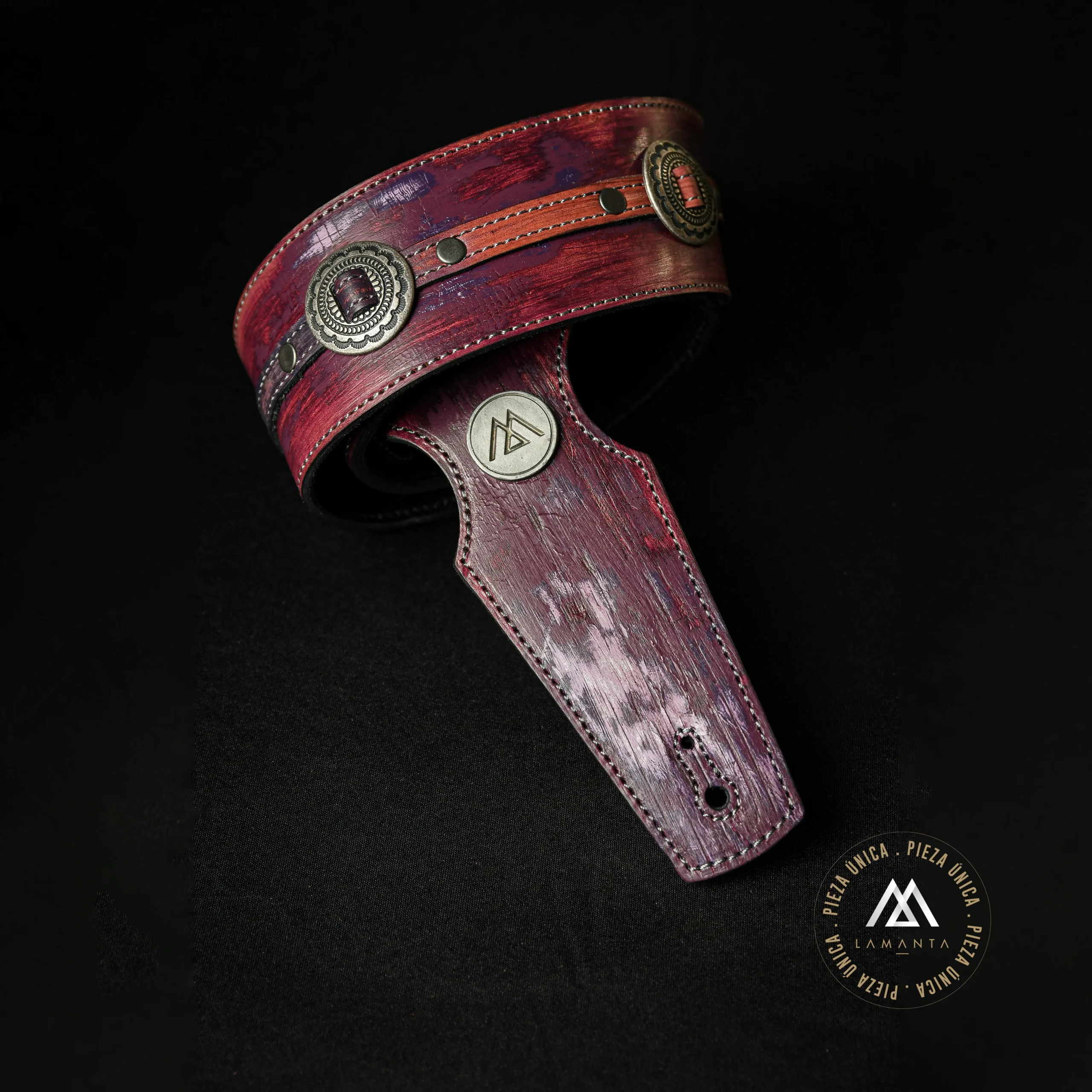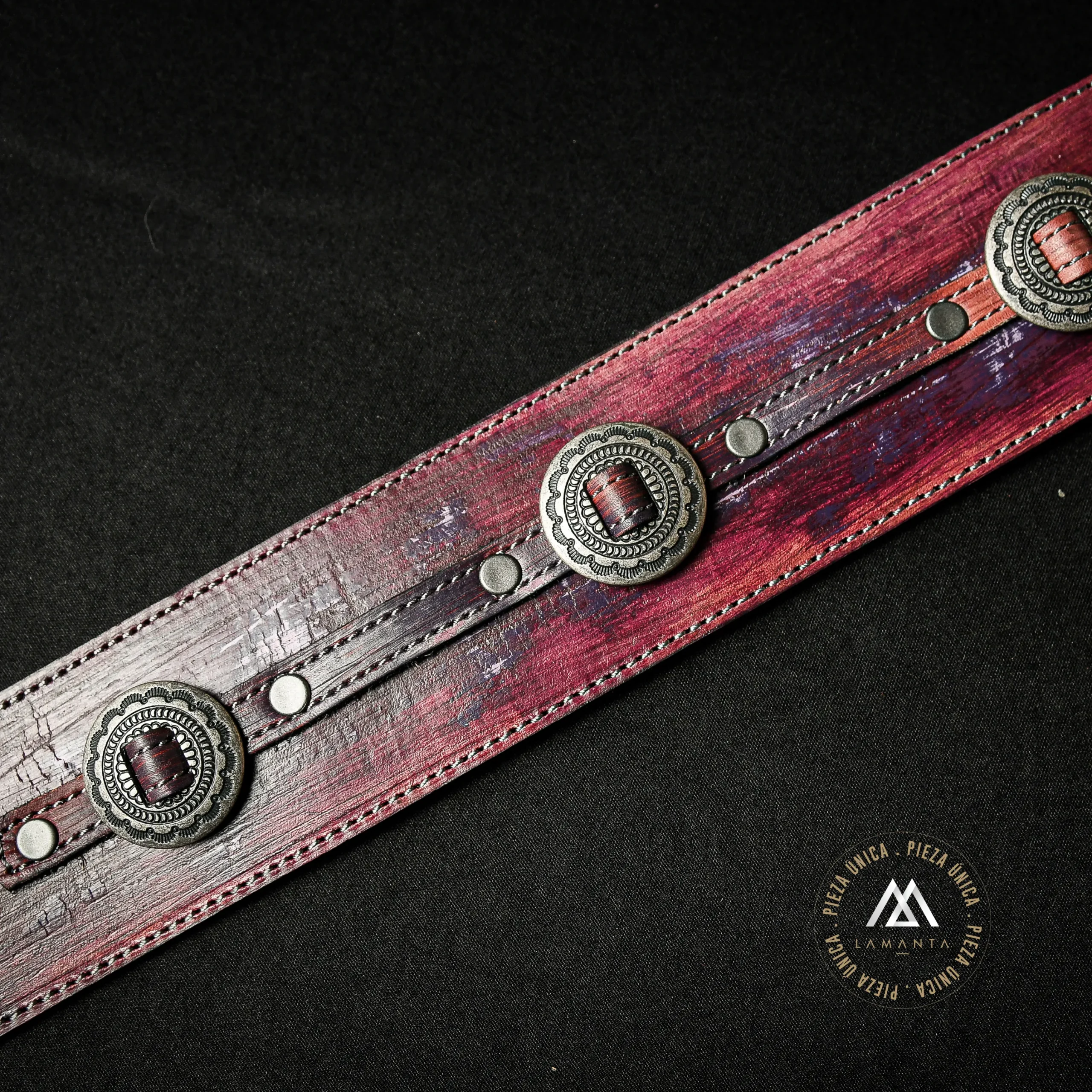 Proceso artesanal Purple Fire Relic con capas de pintura y desgaste manual que generan una textura intensa y marcada. Confeccionada en doble capa de cuero real, incorpora medallones texanos metálicos remachados sobre una tira central.